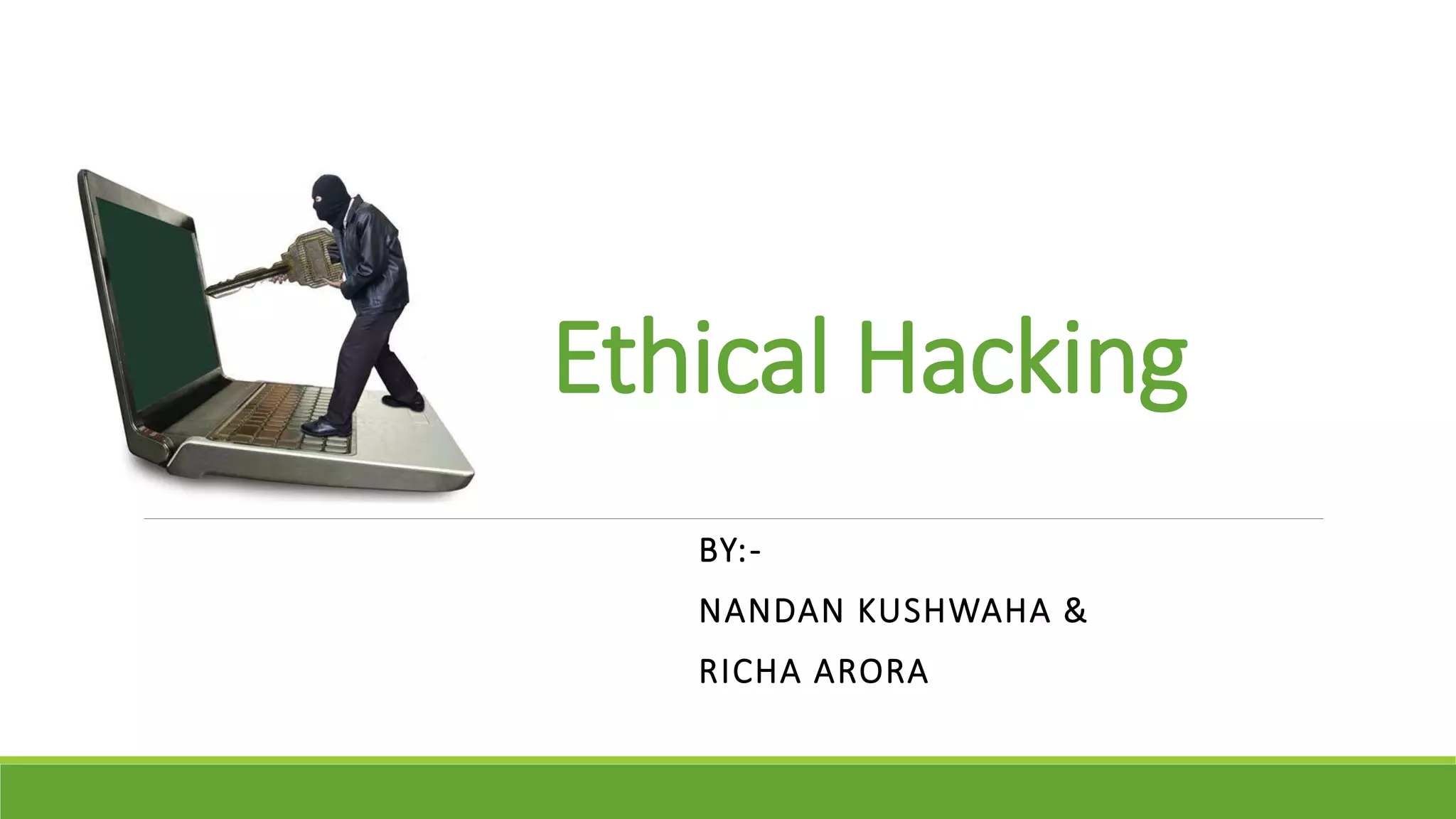 The document provides an overview of ethical hacking, which is legal hacking performed with organizational permission to enhance security. It categorizes hackers into white hat, black hat, and grey hat, explains the ethical hacking process in stages such as footprinting, scanning, enumeration, gaining access, and covering tracks, and discusses methods like sniffing and SQL injection. The conclusion advises caution in sharing passwords and using the internet securely.