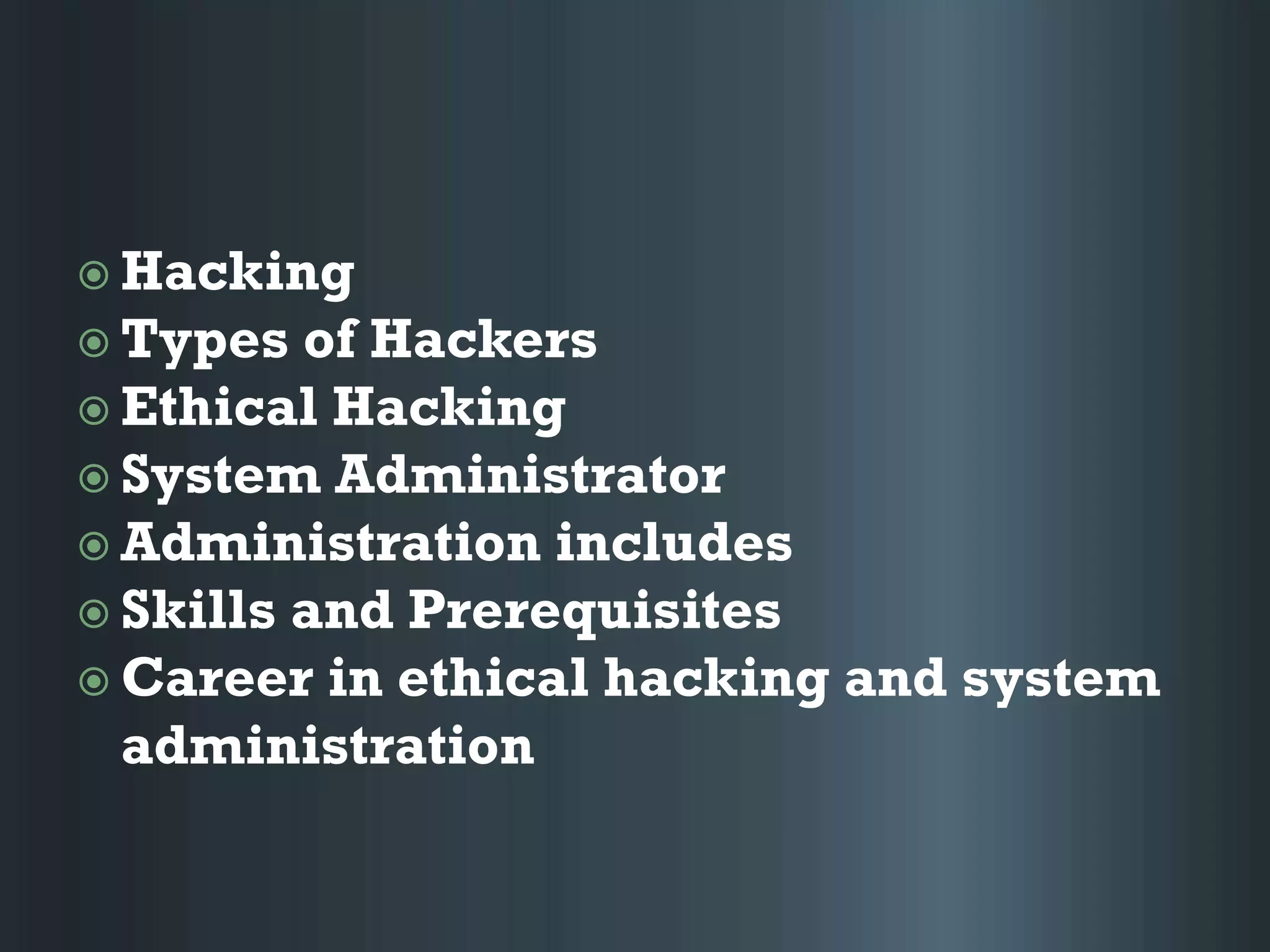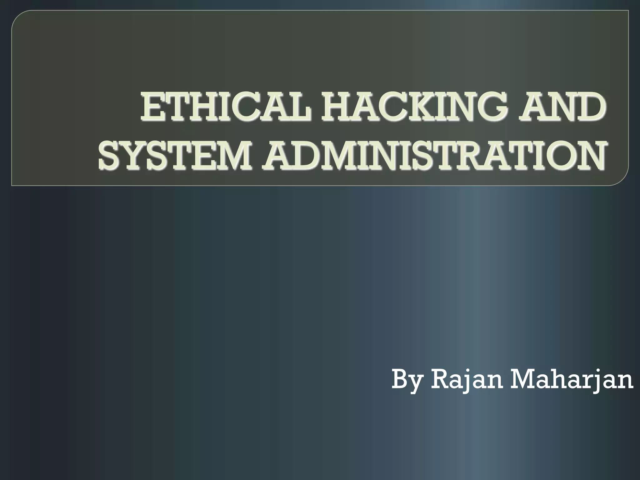 This document discusses ethical hacking and system administration. It defines hacking and different types of hackers such as black hats, white hats, and gray hats. Ethical hacking is described as penetration testing done with permission to help strengthen security. The roles and skills of a system administrator are outlined, including installing, maintaining, and troubleshooting systems and networks. Career opportunities in ethical hacking and system administration are global across many industries.