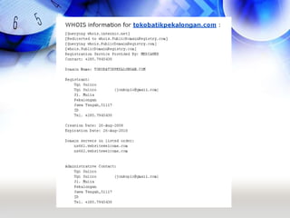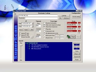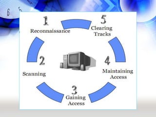 Dokumen tersebut membahas tentang etika dalam hacking dengan menjelaskan pentingnya keamanan sistem informasi, proses hacking, klasifikasi hacker dan testing keamanan.