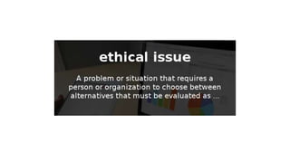 This document discusses ethical issues in nursing. It defines ethics and codes of ethics, including the American Nurses Association code which outlines 9 principles. Common nursing ethics dilemmas are discussed, such as informed consent, cultural diversity, and workplace issues. Ethical principles of autonomy, beneficence, non-maleficence, and justice are explained. The document also covers moral problems nurses may face like uncertainty, dilemmas, and distress. It provides examples of how nurses can clarify ethical decisions and discusses nurse executive behaviors and use of ethical power.