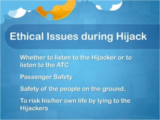 This document discusses the ethical issues pilots may face during a hijacking situation. It presents different views on whether pilots should prioritize obeying hijackers or air traffic control to ensure passenger and ground safety. The document also examines an example of Ethiopian Airlines Flight 961 where pilots insisted they lacked fuel, saving passengers after crashing on land. It considers arguments around utilitarianism and consequences as well as risks of arming pilots who could potentially hijack planes themselves.