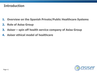 Asiser is a Spanish healthcare company that provides integrated medical services to both domestic and foreign patients. It operates as a spin-off of the Asisa Group, one of Spain's largest private health insurers. Asiser aims to complement Spain's public and private healthcare systems by offering affordable treatment options without limitations. It facilitates medical tourism through traceable cost control and coordinated care both within and across Spanish hospitals and clinics. Asiser views ethical medical tourism as requiring transparency across providers, protection of patients, and government support for its domestic healthcare system.