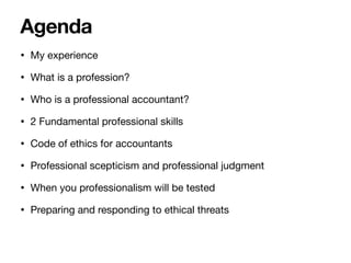 This document outlines an agenda for a talk on ethical issues in accounting. It discusses: