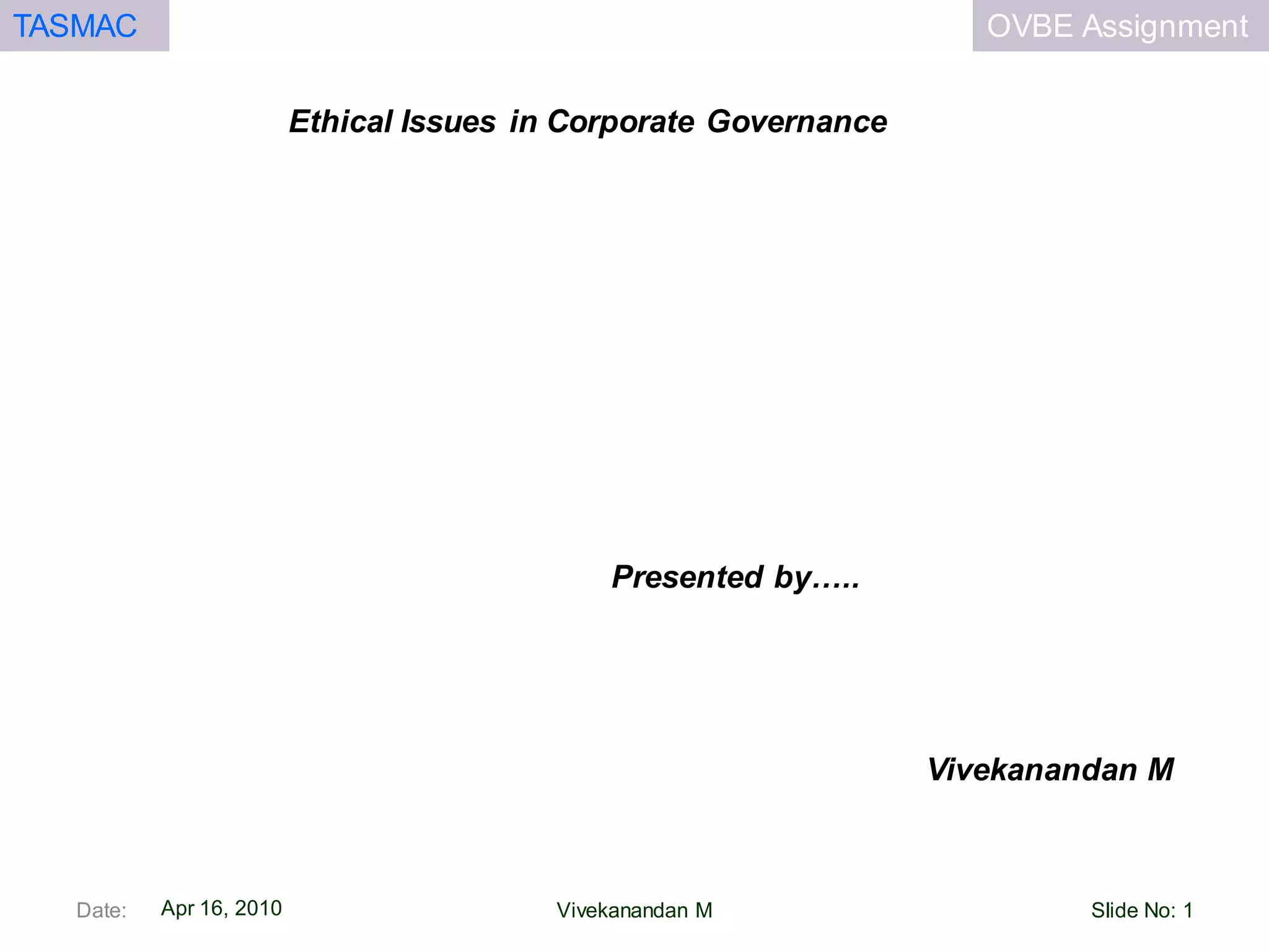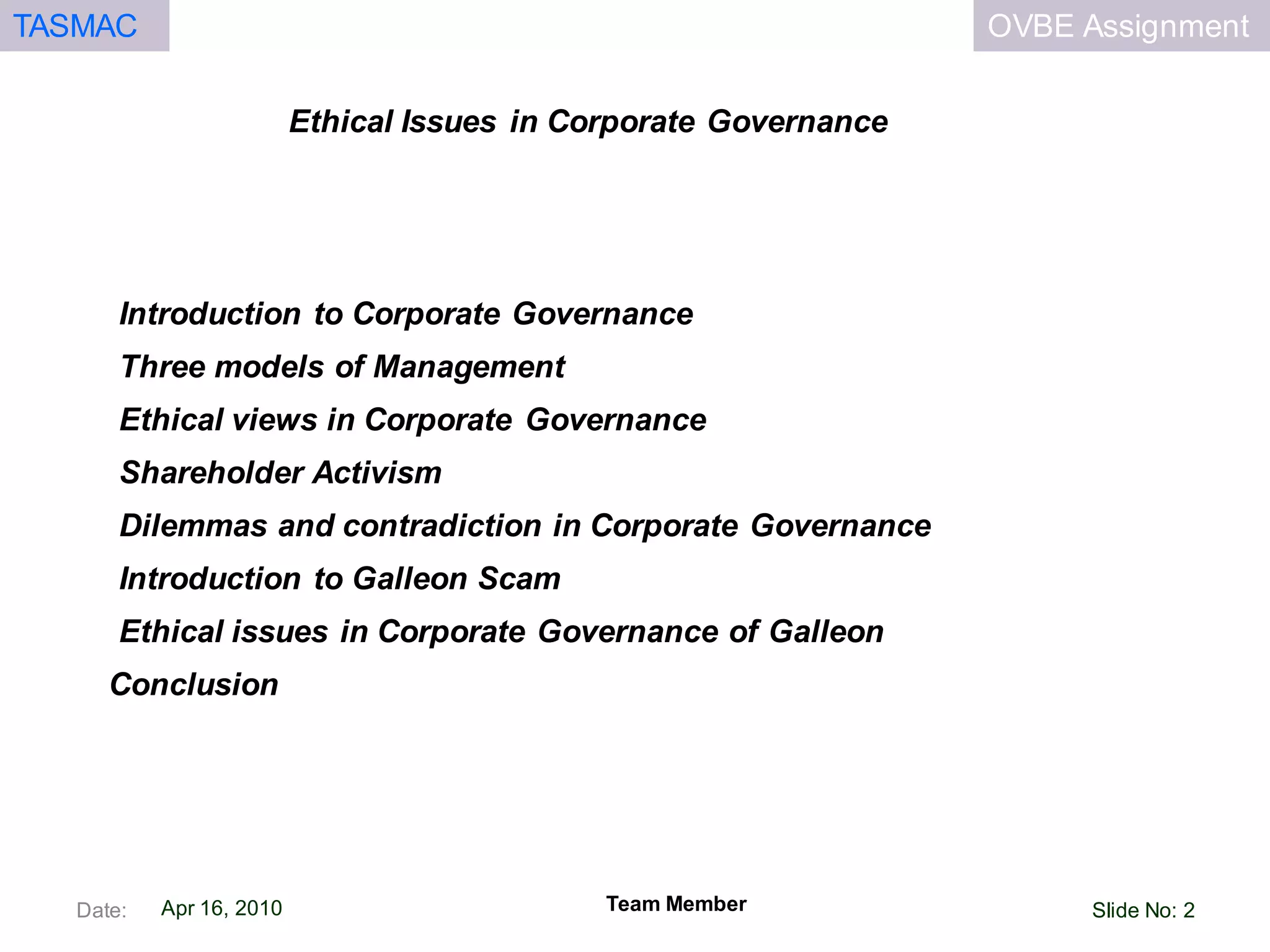 This document discusses ethical issues in corporate governance. It covers three models of management: immoral, moral, and amoral. It also discusses views on integrating ethics into business like the unitarian, separatist, and integration views. Specific topics covered include shareholder activism, dilemmas in industries like alcohol, and the Galleon insider trading scandal. The presentation concludes by suggesting ways for companies to improve ethical compliance like appointing a Chief Ethical Officer and providing employee training.