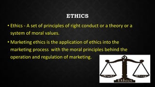 The document discusses marketing ethics, defining it as the application of moral principles in marketing practices that influence customer decisions and organizational behavior. It outlines the benefits of marketing ethics, including transparency, trust-building, and aiding consumer decision-making, while also highlighting ethical criticisms such as high prices, deceptive practices, invasion of privacy, and targeting vulnerable consumers. Overall, it emphasizes the importance of ethical conduct in fostering positive interactions between customers and organizations.