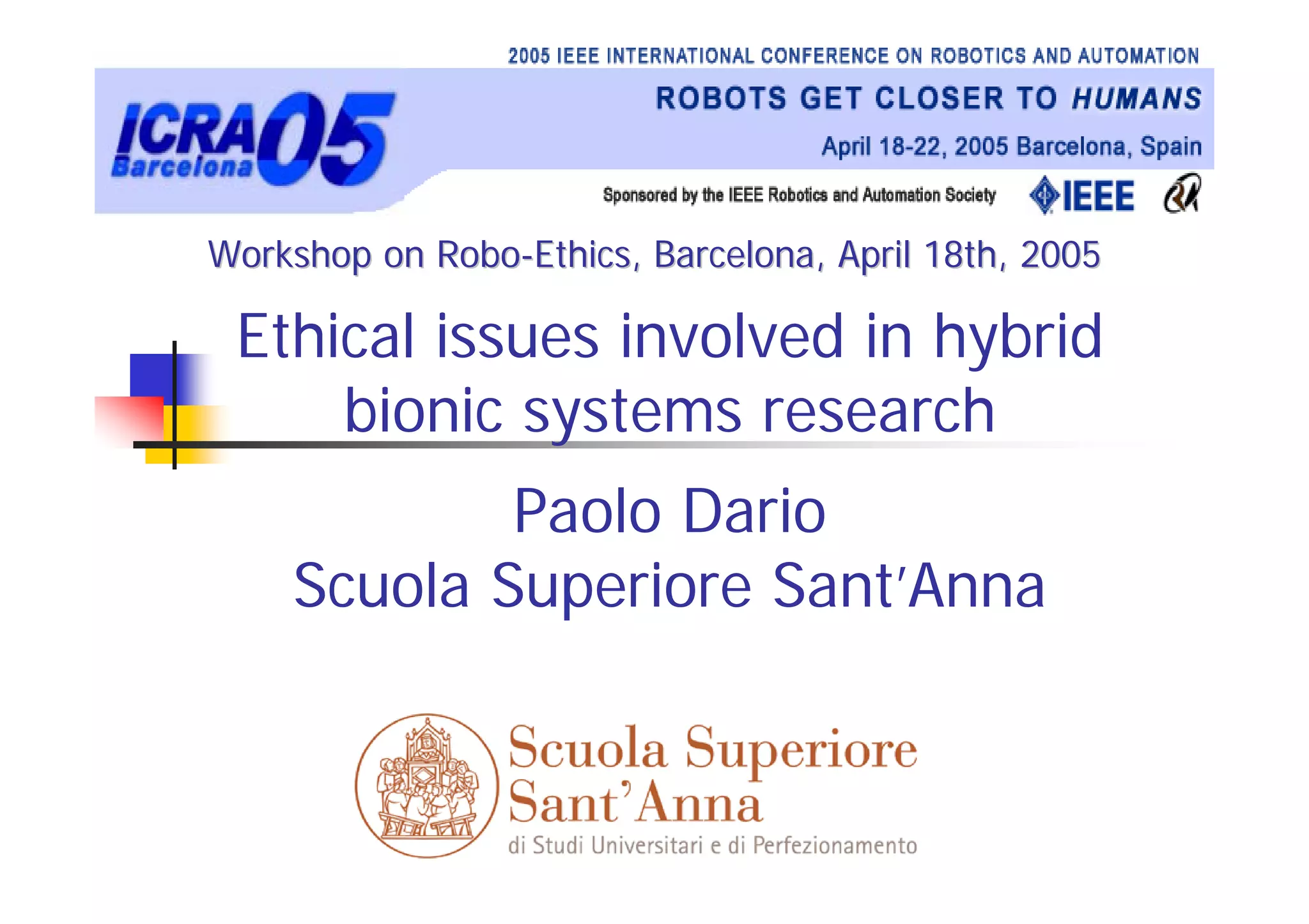 1. The document summarizes a workshop on robo-ethics that discussed two case studies: the CYBERHAND project developing a prosthetic hand connected to the nervous system, and the NEUROBOTICS project investigating hybrid bionic systems.