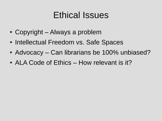 The document discusses various ethical issues faced by librarians, including copyright, intellectual freedom, and the relevance of the ALA code of ethics. It highlights the need for librarians to balance advocacy for marginalized populations while respecting copyright and ensuring intellectual freedom, with a focus on the importance of ethical training and diverse representation in the library profession. Additionally, it underscores the impact of having an ethics code on organizational effectiveness and employee engagement.