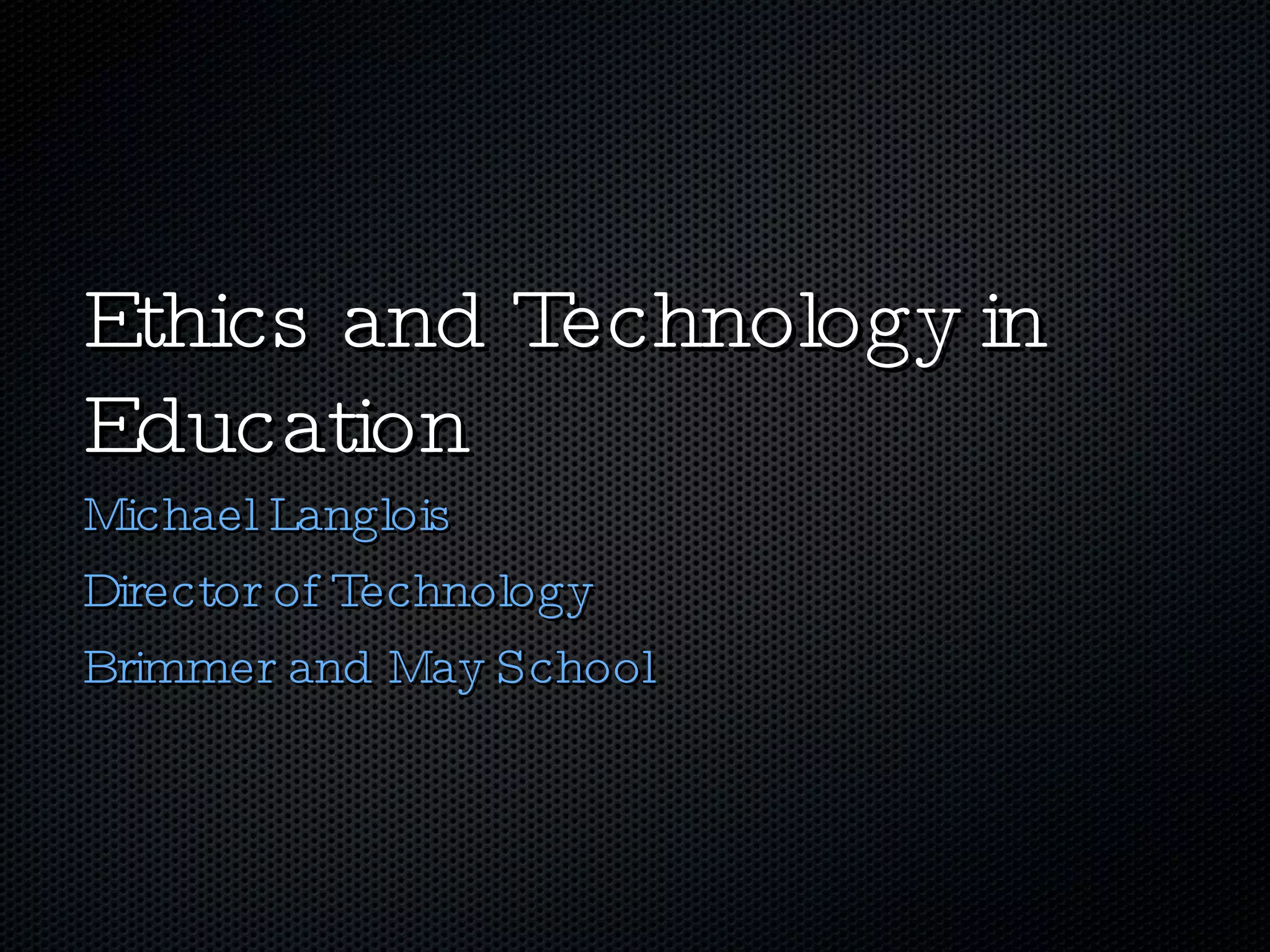 The document discusses ethics and technology in education. It outlines various ethical concerns related to technology use in schools, including privacy, intellectual property, and appropriate behavior. It provides recommendations for educators to emphasize ethical digital citizenship, such as drawing parallels between online and offline behavior, enforcing acceptable use policies, and modeling good digital practices like proper citation and critical thinking. Resources for teaching cyber ethics to students and educators are also listed.