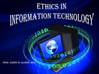 The document discusses various topics relating to ethics and information technology including definitions of ethics, computer ethics, and issues like privacy, property, and access. It also covers computer viruses, types of computer crimes, hacking, software piracy, and ethical dilemmas. Computer viruses are defined as programs designed to spread and interfere with computers. Types of computer crimes include those targeting information, medium of attack, tools used, and motives like economic or psychological gain. Hacking and software piracy are also defined and their advantages and disadvantages discussed. Ethical dilemmas concern areas like privacy, information accuracy, access, and intellectual property rights.