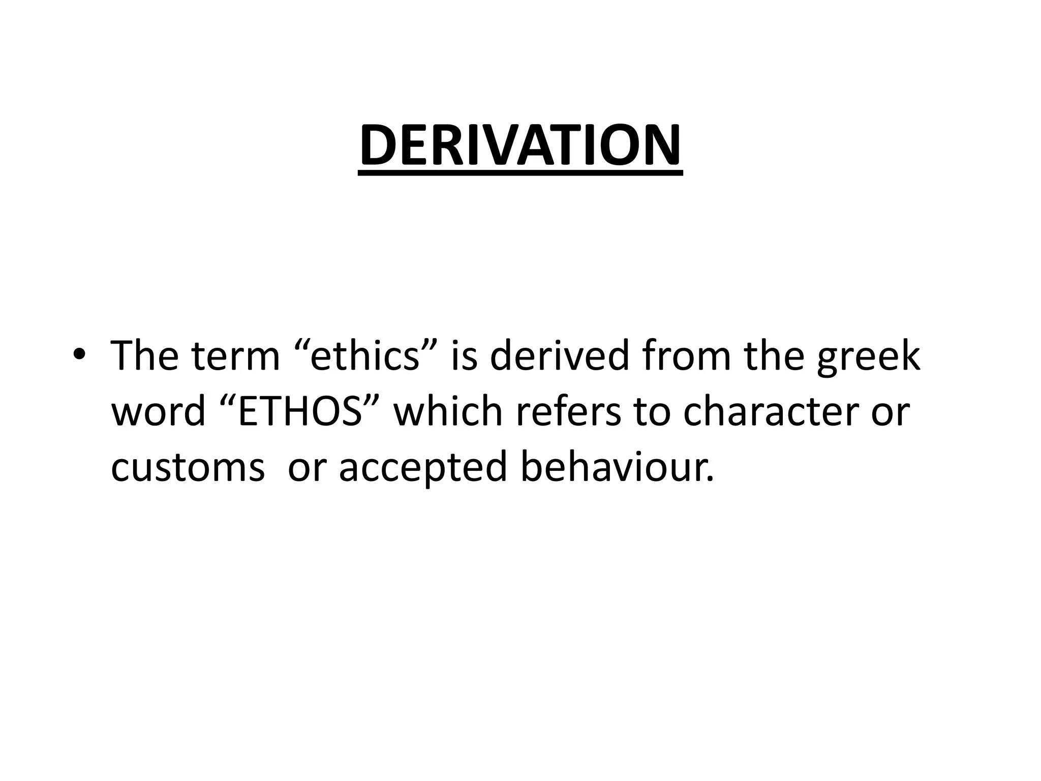 Ethics is derived from the Greek word "ethos" meaning character or customs. It is defined as the study of moral philosophy and standards of conduct. Ethics addresses questions about morality and what constitutes good and bad or right and wrong behavior. It seeks to determine the proper course of action for humans. There are nine main theories of ethics that approach questions of morality from different perspectives such as the consequences of actions, sets of values or principles, and moral development.