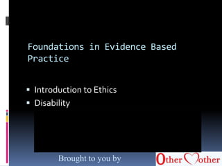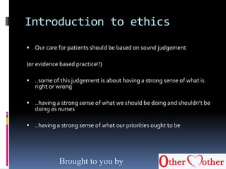 This document provides an overview of foundations in evidence-based practice and ethics. It introduces ethics and discusses key principles like autonomy, beneficence, non-maleficence, and justice. Ethical issues that nurses may face in daily practice are described, including respecting confidentiality and identifying ethical dilemmas. Sources of guidance for healthcare ethics like the NMC Code and Principles of Biomedical Ethics are also summarized. The document contrasts consequentialism and deontology as two approaches to ethics and decision making.