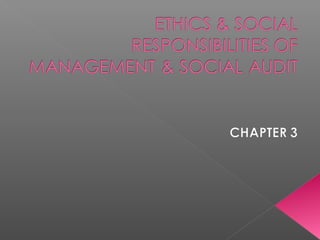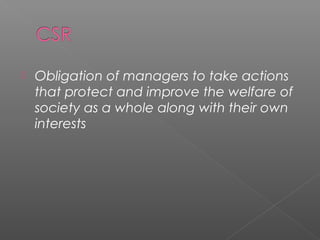 The document outlines the responsibilities and obligations of managers and businesses to society. It discusses how businesses should serve their customers, employees, and communities. Specifically, it mentions producing quality products, establishing fair prices, providing good customer service, ensuring wide product availability, offering fair compensation and good working conditions to employees, and supporting local communities through philanthropic and educational initiatives. The document also discusses factors that influence corporate social responsibility and how businesses can develop ethics programs and social responsibility strategies.