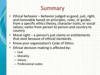 This document discusses professional ethics and issues in developing organizations. It defines ethics as a commitment to moral values and distinguishing right from wrong. Values provide guidance for determining what is right, good, and just. Ethics concern actions and decisions that are consistent with one's values. The document poses questions for evaluating an organization's ethics, such as whether it has a widely disseminated ethics code and takes a tough stand on ethical issues. Reasons for having a code of ethics include building trust, increasing awareness of issues, and guiding decision-making. The document outlines standards for professional ethics, including demonstrating concern for others and valuing privacy and diversity.