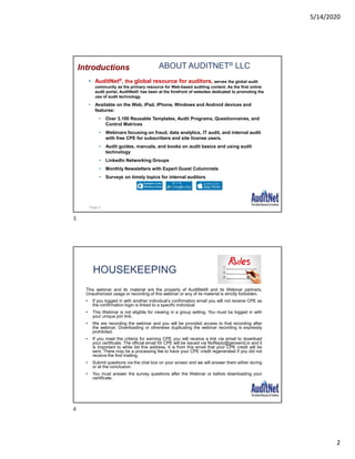 The document provides an overview of ethics for internal auditors, emphasizing the importance of ethical behavior and professional standards in auditing. It discusses key topics such as the necessity of ethics in personal and organizational contexts, various ethical theories, including religious perspectives, and the IIA Code of Ethics that auditors must adhere to. The webinar is structured to inform attendees about ethical guidelines, CPE credit details, and the professional responsibilities of internal auditors.