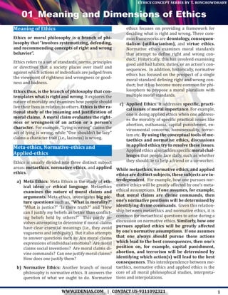 The document discusses the concept of ethics, dividing it into three main branches: meta-ethics, normative ethics, and applied ethics, each examining different aspects of moral philosophy. It also explores the concept of values, distinguishing between human values, intrinsic and extrinsic values, and the formation of these values through culture and socialization. Furthermore, it outlines the components of attitudes, their dimensions, and the relationship between values and attitudes.