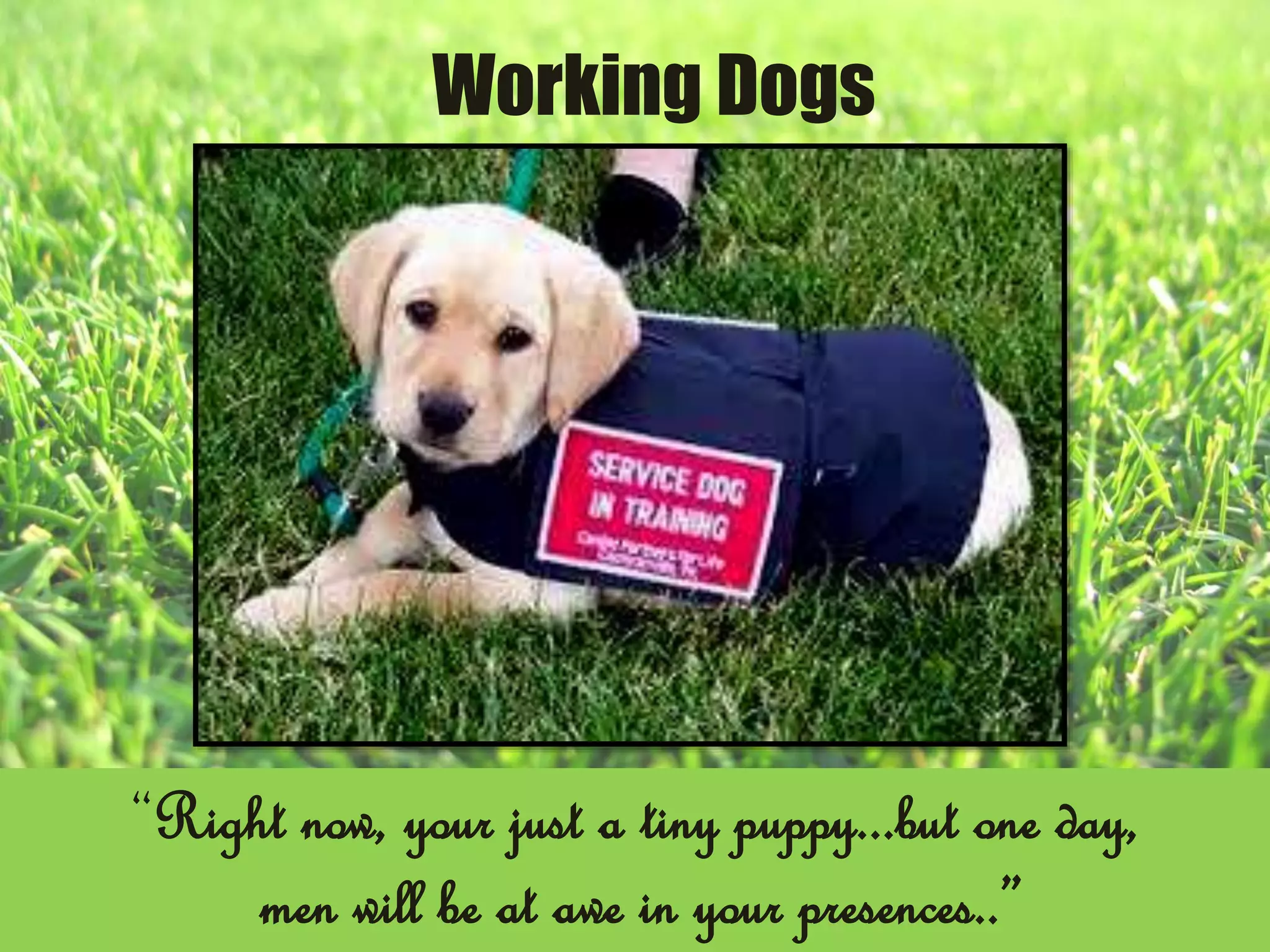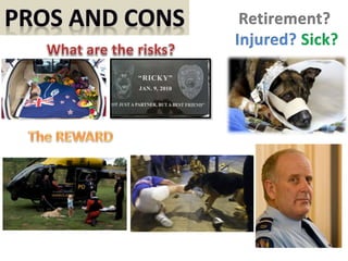 Working dogs provide essential services and assistance to their human partners. They undergo extensive training from a young age to learn skills like guiding the blind, detecting diseases, searching for survivors, and providing emotional support. While their work is rewarding, it also carries risks like injury, stress, and an early retirement age. Ensuring the welfare and proper care of these hard-working dogs after their service is important both for the dogs' well-being and to maintain the partnerships between humans and their canine assistants.