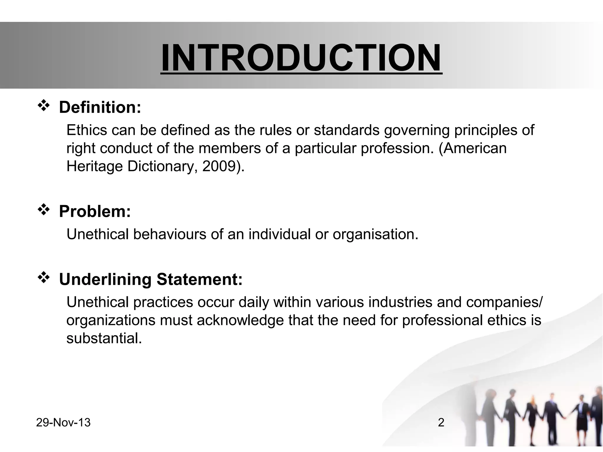 This document discusses ethics in engineering and highlights a case study involving an ammonia hose company. It defines ethics as rules governing conduct within a profession. The case study describes how the company used an untested material in their hoses that degraded over time, leading to failures and injuries. This raised issues of the engineers' accountability and whether risks were properly assessed and monitored. The document recommends engineers follow codes of ethics and integrate ethical decision making into their work.