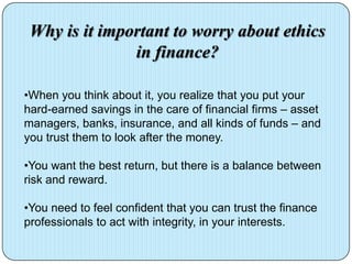 This document discusses the importance of ethics in the finance sector. It notes that individuals trust financial firms with their hard-earned savings and want to feel confident that professionals will act with integrity. It then provides an overview of regulators and players in the Indian financial sector before detailing some common ethical violations like insider trading and prioritizing shareholder over stakeholder interests. Finally, it suggests some ways to curb unethical behavior such as improving standards, strengthening laws, and enhancing the role of auditors.