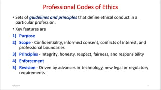 The document provides an overview of ethics in information technology, discussing professional codes of ethics, the benefits they provide, and common ethical issues related to IT users. It also details various professional organizations in the IT field, classifications of computer crime perpetrators, and types of cyber attacks, along with preventive measures and security strategies. Furthermore, it emphasizes the importance of security policies in protecting IT assets and ensuring compliance with regulations.