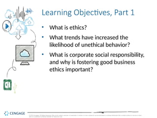 The document provides an overview of ethics in information technology, defining ethics, morals, and laws, while emphasizing the importance of fostering good business ethics and corporate social responsibility (CSR). It discusses trends that have increased the likelihood of unethical behavior, such as complex work environments and economic pressures, and highlights measures organizations can take to improve their ethical standards. Additionally, it emphasizes the need for ethical considerations in decision-making processes and the growing risks associated with the use of information technology.