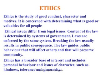 The document discusses ethics in nursing. It defines ethics as the study of good conduct and character and how it differs from legal issues. It outlines key ethical principles like autonomy, justice, and beneficence. The International Council of Nursing Code of Ethics is also summarized, which establishes the nurse's responsibilities to people in need of care, nursing practices, society, coworkers, and the profession. The code aims to guide ethical nursing behavior and uphold standards of care, confidentiality, and professionalism.