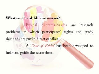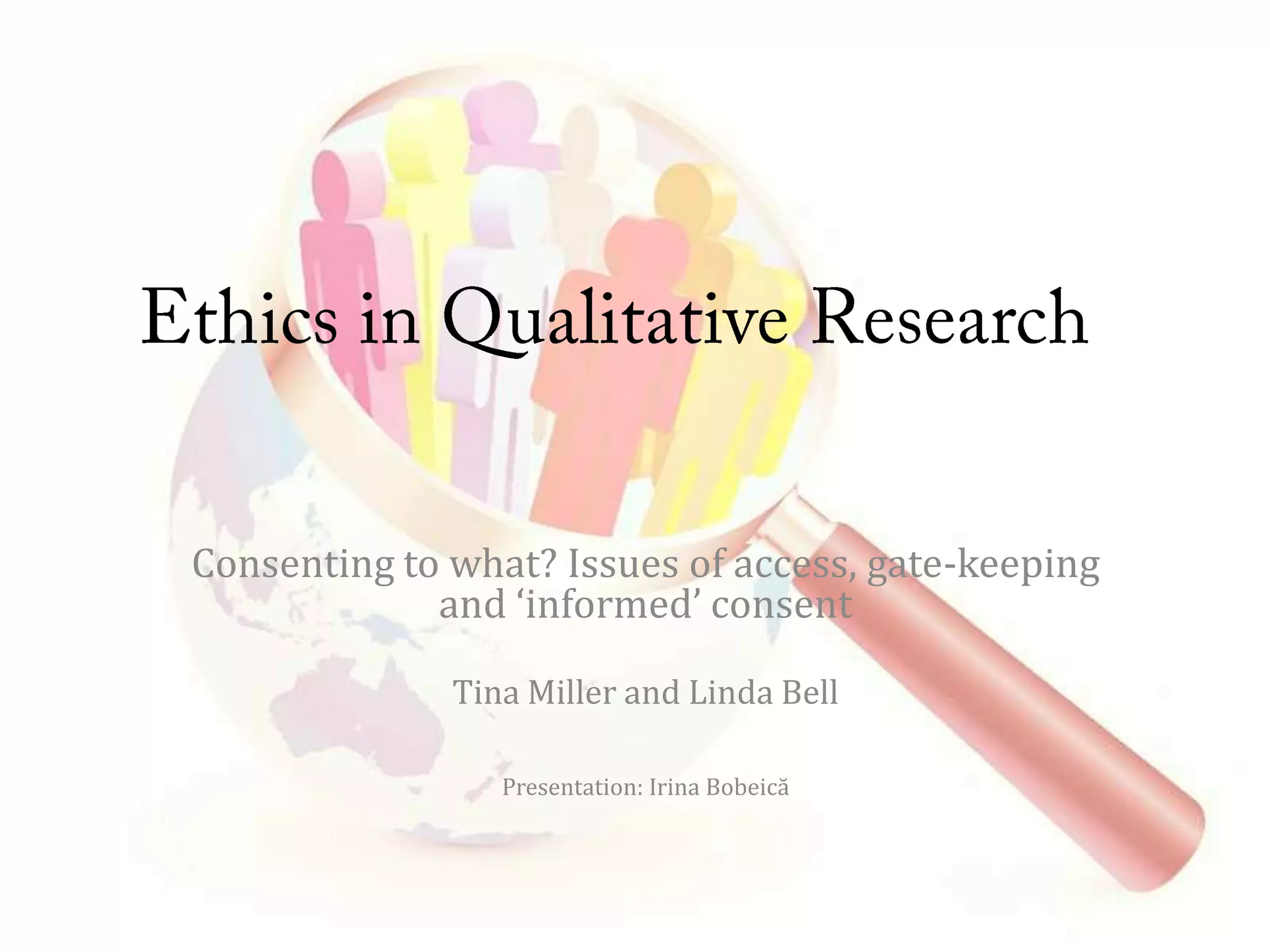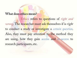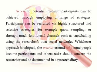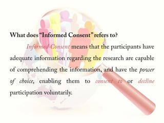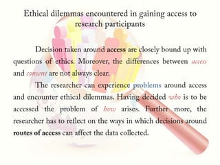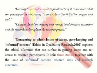 This document discusses issues related to informed consent in research, including access, gatekeeping, and what individuals are truly consenting to. Researchers must consider how much information participants are given and understand, as well as who controls access to certain groups for studies. True informed consent requires fully explaining the nature and potential impacts of the research in an accessible way.