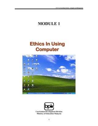 This document is a module on ethics in using computers from the Ministry of Education Malaysia. It discusses important concepts around computer ethics including copyright, plagiarism, and unethical computer use. The module aims to teach students the proper ethics around topics such as requesting permission before sharing or using others' work, respecting copyright laws, and avoiding plagiarism. It includes activities for students to learn about these issues through examples and exercises.