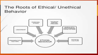 Ethics are moral principles that govern behavior, especially important in international business between countries. Unethical practices in international business include human rights violations, discrimination, bribery, unsafe products, and intellectual property theft. As global trade has grown, multinational corporations sometimes transfer jobs to lower wage countries without investing in community development or considering cultural differences. Making ethical decisions in international business requires respecting local laws and customs, human rights, and finding balanced solutions between cultural perspectives.