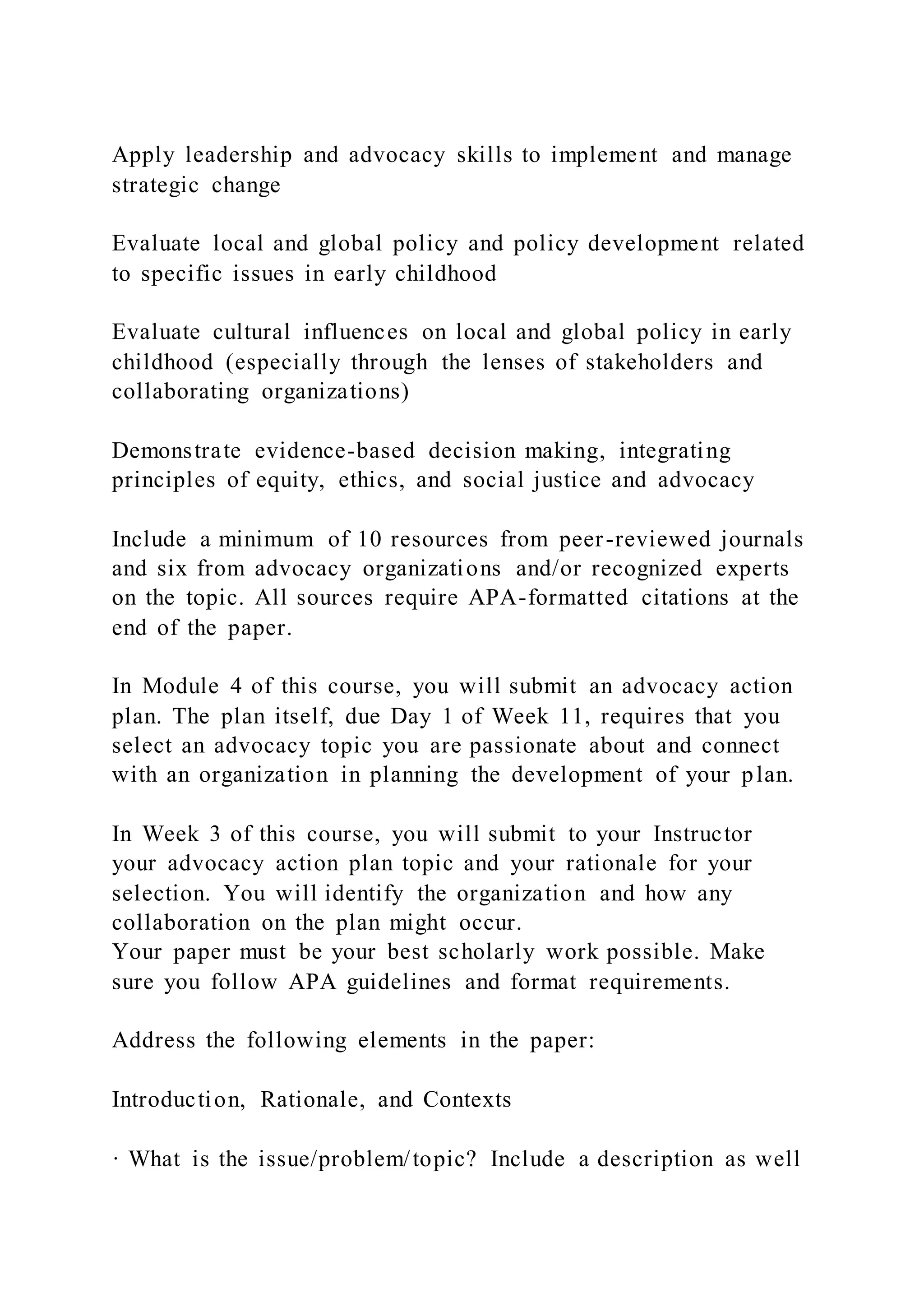 The document serves as an ethics interview guide and outlines an advocacy action plan for a course related to early childhood education. It includes questions for interviewing leaders about ethical dilemmas they've faced and emphasizes the importance of ethics in problem-solving and decision-making. Additionally, it details the requirements for creating an advocacy plan, including policy evaluation and stakeholder analysis, to effectively support children's and families' needs in early childhood settings.