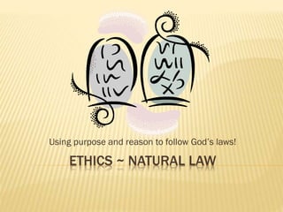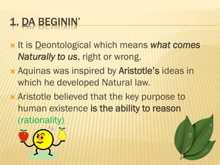 Aquinas' natural law theory holds that humans have an innate ability to reason which allows them to discern moral truths and understand their purpose as given by God. According to Aquinas, natural law establishes absolute moral rules called primary precepts related to worshipping God, orderly society, reproduction, learning, and defending life. Secondary precepts provide more specific guidance that allows for flexibility in extreme cases. Virtues like prudence, justice, fortitude and temperance help fulfill human nature and avoid sin. Interior acts involve good actions with good motives, while exterior acts have good actions but wrong motives.