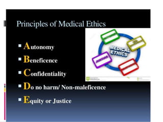 The document discusses medical ethics and disclosure principles in the context of the COVID-19 pandemic, emphasizing core values like autonomy, beneficence, and confidentiality. It highlights ethical dilemmas faced during the pandemic, such as resource allocation and maintaining patient privacy while ensuring public health. Furthermore, it outlines guidelines for disclosure related to infectious diseases, emphasizing the need for regulated approaches to information sharing and public health education.