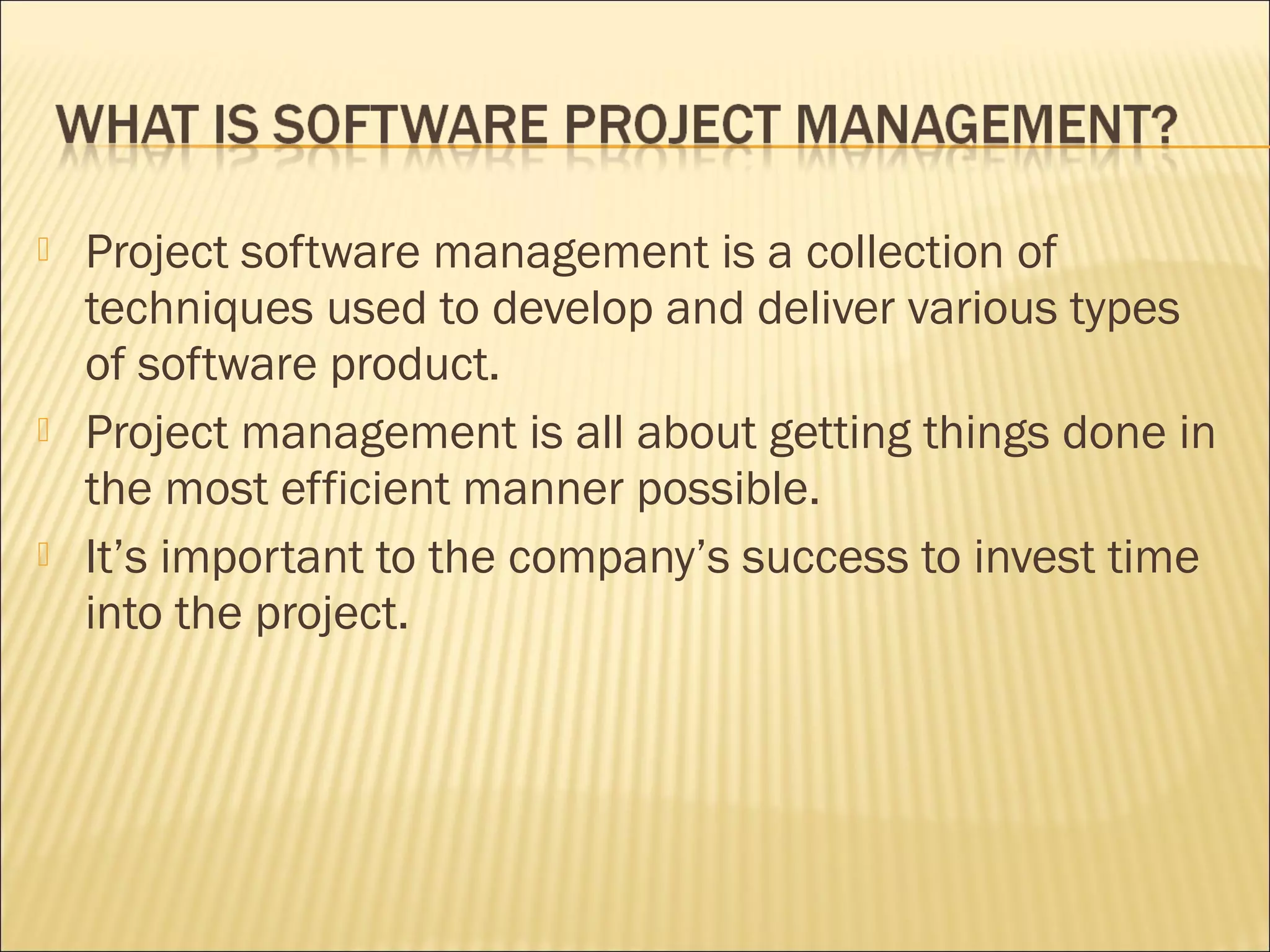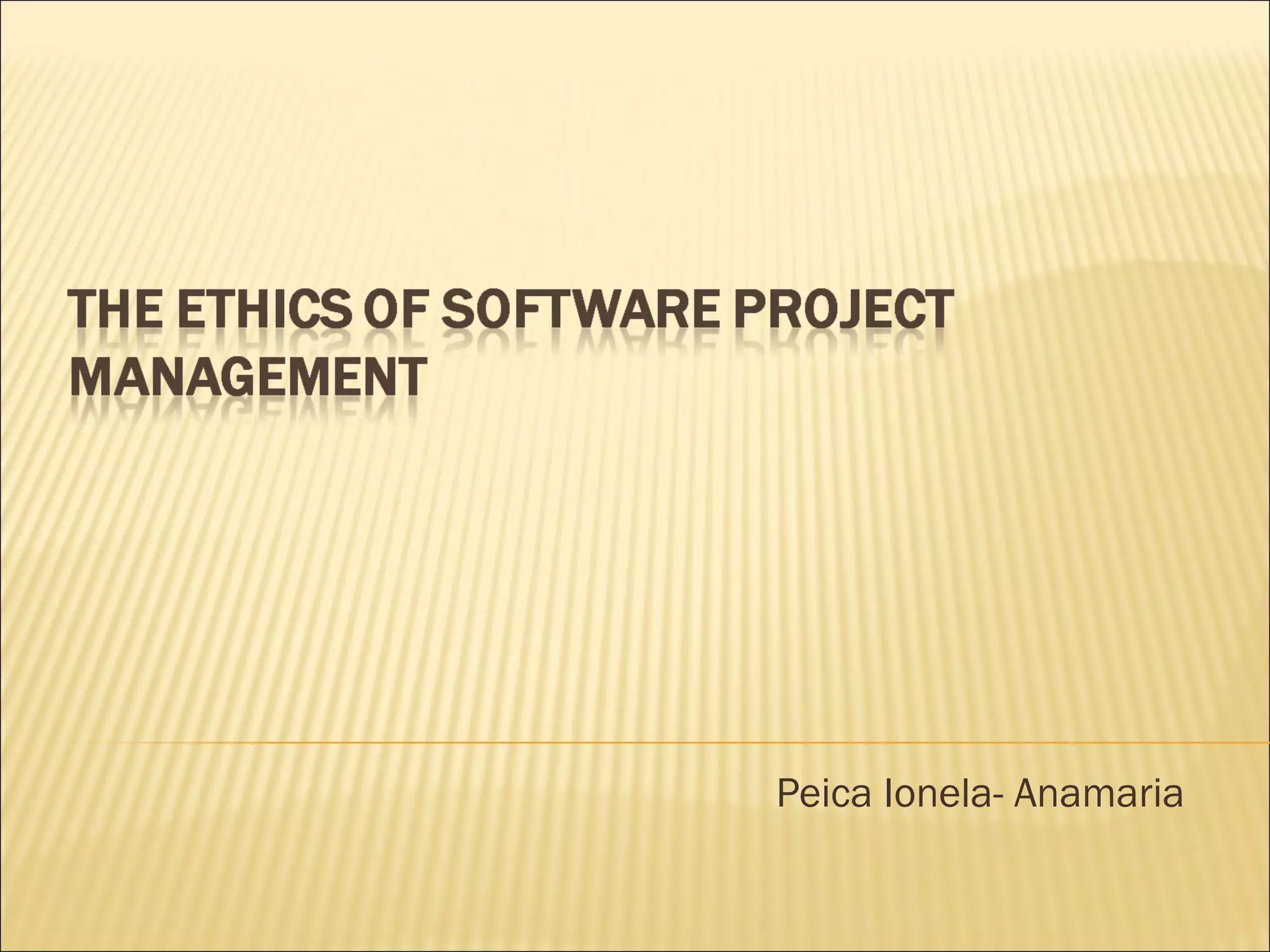 Project software management involves techniques for developing and delivering software. It is important for a company's success to invest time in project management to get things done efficiently. Computer ethics aims to ensure technology advances while protecting human values. Stakeholder impact analysis identifies how a project may negatively affect stakeholders like customers, suppliers, and their goals. Proper computer ethics assurance requires plans, participation in development, and evaluating products and processes to ensure they follow ethical codes. Stakeholders are individuals or groups affected by a project, and they can have different roles for customers versus suppliers.