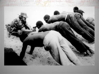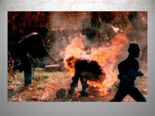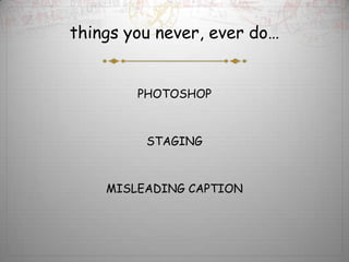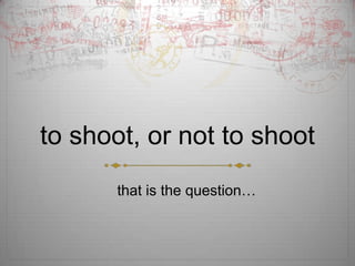 The document discusses ethical issues photographers may face, including whether they should intervene if witnessing a crime or human rights violation while documenting an event as a journalist. It notes examples from the past where photographers documented torture and violence rather than intervening. It also discusses the debate around whether journalists have a duty to remain neutral observers or should act to prevent harm.