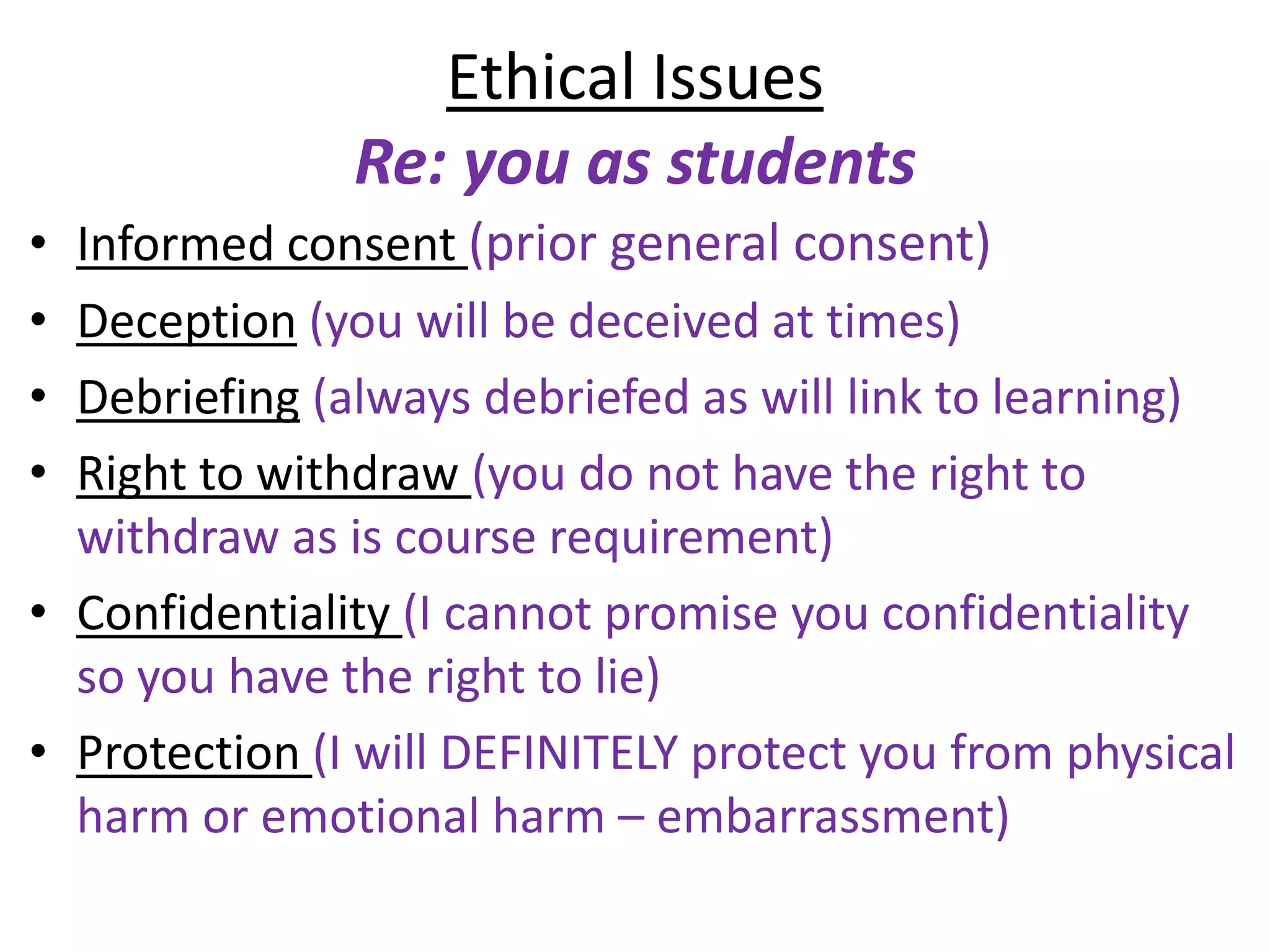 - Protection - there is a duty of care to protect children from potential harm, embarrassment or distress. Research methods need to be age-appropriate.