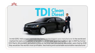 Volkswagen installed "defeat devices" in 11 million of its diesel vehicles worldwide between 2008-2015 to circumvent emissions tests. In 2015, the EPA issued Volkswagen with a notice of violation for installing the devices in US vehicles. The scandal had major financial and reputational consequences for Volkswagen, wiping out a third of the company's market value. Former CEO Martin Winterkorn resigned under threat of criminal investigation. The company faced billions in fines and lawsuits, and its actions damaged consumer trust and its public image.