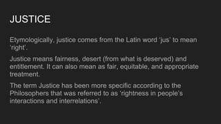 This document discusses different theories and principles of justice. It defines justice and distinguishes between formal and material principles of justice. Material principles specify how goods should be distributed, such as equal shares, according to need, merit, effort or contribution. The document also outlines three types of justice: distributive, criminal, and rectificatory. Finally, it presents four paradigm approaches to justice: utilitarianism focuses on the greatest good for the greatest number, egalitarianism emphasizes equal distribution, libertarianism stresses individual liberty, and communitarianism derives justice from community standards.