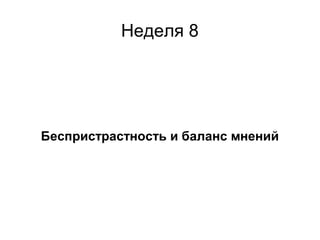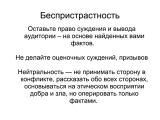 Документ обсуждает важность беспристрастности и балансировки мнений в журналистике, подчеркивая необходимость оставлять право суждения аудитории на основе фактов. Он предостерегает от сенсационализма и манипуляций с информацией, акцентируя на объективности и уважении к этическим нормам. Напоминается, что журналисты должны избегать подстрекательства и принимать во внимание все стороны конфликта.