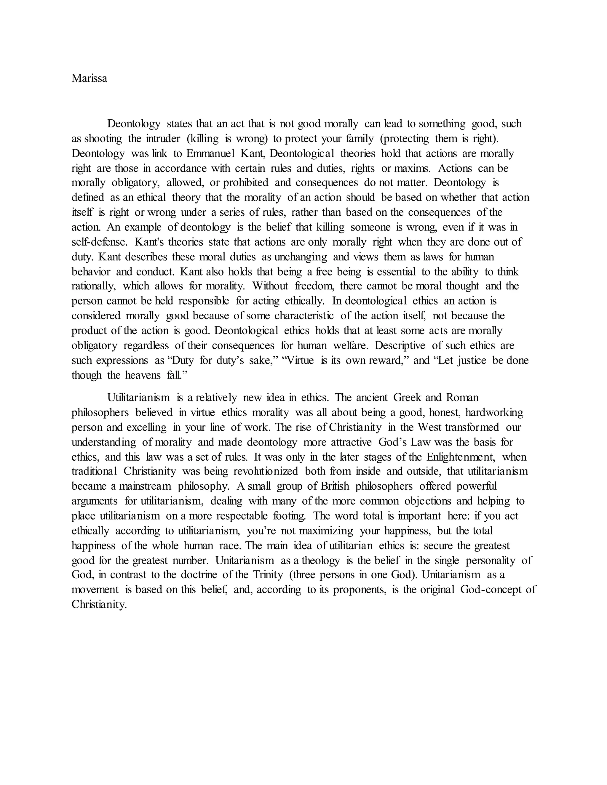 Deontology is an ethical theory that determines morality based on adherence to rules of duty, rather than consequences. It became prominent through the work of Immanuel Kant, who argued that morality depends on acting in accordance with duty and respecting rational autonomy. Deontology holds that some actions are morally obligatory regardless of their consequences. Utilitarianism is a consequentialist theory that determines morality based on producing the greatest happiness for the greatest number of people. It focuses on outcomes rather than rules or duties.