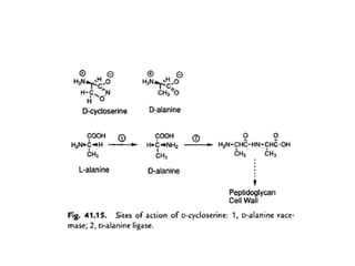 This document discusses the anti-tuberculosis drug ethionamide. It is a second-line drug that is an analogue of isonicotinamide but contains sulfur instead of oxygen. It is less active in vitro but more active in vivo due to increased lipophilicity from its ethyl group. Its mechanism of action involves conversion to its active metabolite ethionamide sulfoxide via oxidation, which then inactivates the inhA enoyl reductase enzyme. Less than 1% is excreted unchanged in urine with the rest excreted as metabolites.