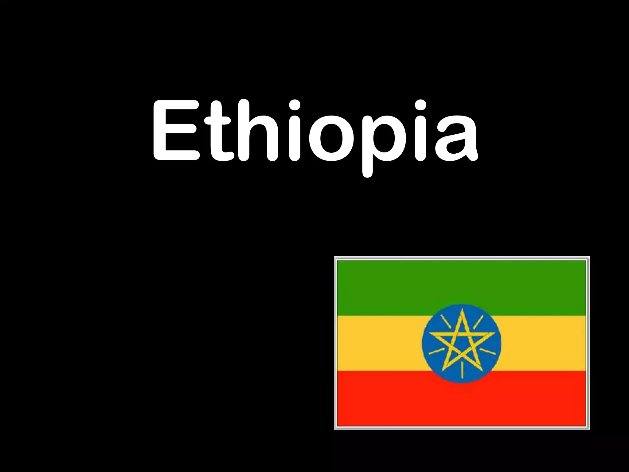 Ethiopia has a population of over 90 million people and its capital and largest city is Addis Ababa. It has a hot climate with low rainfall, making agriculture difficult and leading to periods of famine. The economy relies heavily on agriculture, particularly coffee exports, and the population includes over 80 ethnic groups each with their own unique culture and language.