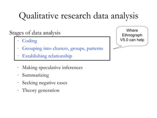 The document discusses the process of qualitative data analysis using the software tool Ethnograph V5.0. It describes the stages of qualitative data collection and analysis including coding, grouping, establishing relationships and theory generation. It then explains the various steps that can be taken using Ethnograph V5.0 to facilitate the analytic process, such as creating projects, entering data, coding data, conducting searches, creating memos and search filters using face sheets and identifier sheets. Pros and cons of using the software are also mentioned.