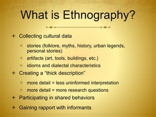 An ethnography is a descriptive study of a cultural group that collects cultural data like stories, artifacts, language characteristics, and participates in shared behaviors. It aims to create a thick description of the group through qualitative and quantitative data. An ethnography provides a scientific account of the cultural behaviors of a bounded group through their ethnographic present using mixed methods from an emic perspective to develop models of human behavior within that group.
