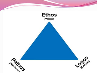 The document discusses the three rhetorical appeals of ethos, pathos, and logos. Ethos involves establishing credibility and authority to persuade the audience. Pathos involves appealing to the audience's emotions. Logos involves using logical reasoning and evidence to make arguments understandable and persuasive to the audience. Examples are provided for how these appeals can be used in different types of contemporary writing.