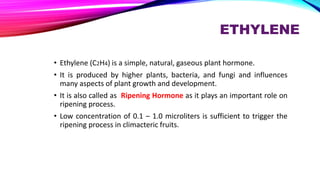 3. Ethylene is produced by plants, bacteria, and fungi. It is involved in processes like stimulating seed germination, root and shoot growth, flowering, leaf and fruit drop, and fruit ripening.