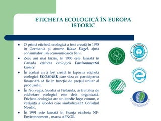Eticheta ecologică europeană, introdusă oficial în 1992, servește ca un 'pașaport' pentru produsele care îndeplinesc criterii ecologice stricte, având scopul de a promova dezvoltarea durabilă și de a reduce impactul asupra mediului. În România, eticheta ecologică a fost implementată în 2002, permițând certificarea unei game variate de produse, excluzându-le pe cele alimentare și farmaceutice. Această etichetare oferă produse un avantaj competitiv pe piață și contribuie la un consum mai responsabil și sustenabil.