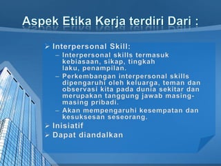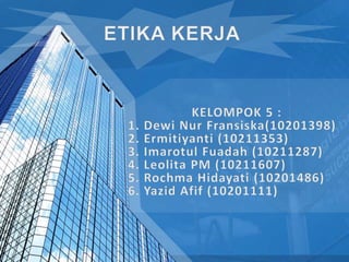 Dokumen ini membahas konsep etika yang mencakup definisi, ruang lingkup, dan pentingnya dalam berbagai aspek kehidupan seperti keluarga, profesi, dan masyarakat. Etika dianggap sebagai seperangkat norma yang mengatur perilaku manusia untuk menciptakan hubungan yang harmonis dan produktif. Selain itu, penerapan etika kerja dapat meningkatkan kepercayaan dan kualitas hasil kerja.