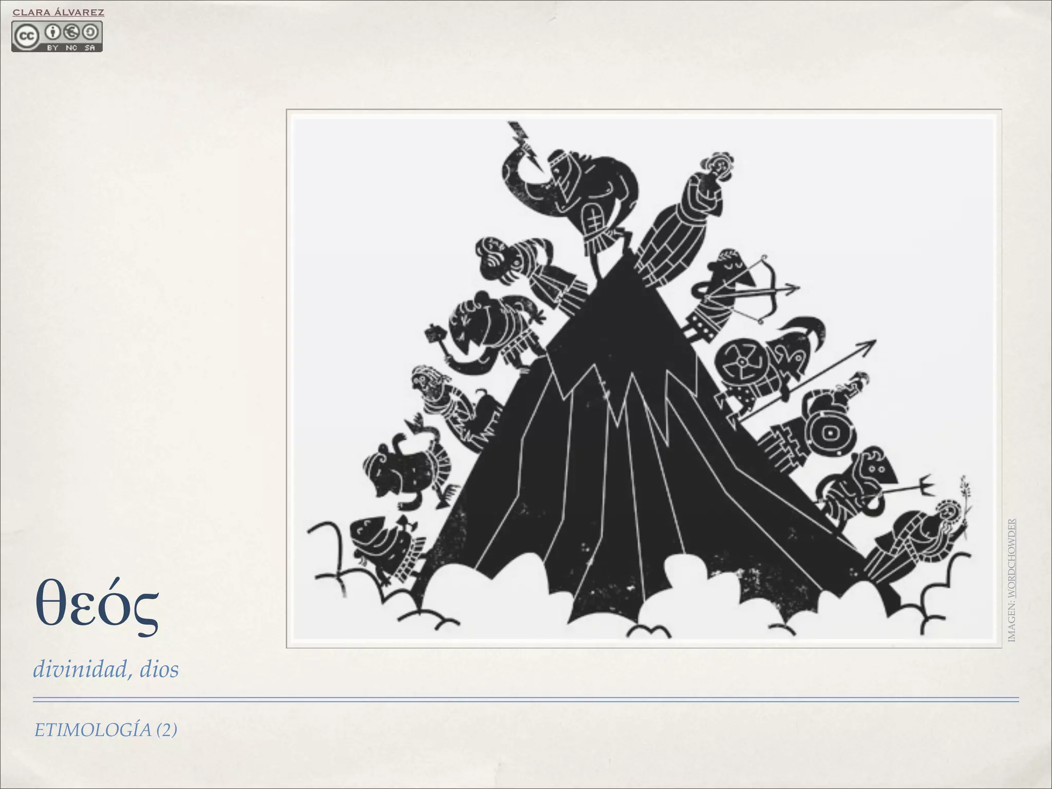 Helenismos relacionados con θεός, divinidad. Contiene imágenes y una hoja de ejercicios para completar el significado de prefijos, sufijos y otras raíces griegas.