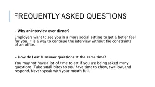 This document provides etiquette guidelines for dining interviews and business meals. It discusses interview dinner etiquette such as taking small bites to answer questions. Proper dining etiquette is also covered, including using various utensils for different courses, placing the napkin on the lap, and signaling to the waiter that a course is finished. Maintaining good posture and manners like not talking with your mouth full or leaving belongings on the table are also emphasized.