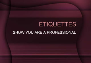 This document provides etiquette tips for professionals to present themselves professionally. Some key points include dressing professionally in light colored formal shirts, ties, matching socks, and polished shoes. For phone interactions, be polite, pronounce names properly, respect clients' time, answer calls immediately, and be aware of background noise. When meeting clients, be on time, greet them with a smile, focus on their face, know their names, avoid confidential discussions, and get to the point quickly. In the office, communicate well, respect coworkers, mentor newcomers, maintain a positive attitude, and avoid overworking.