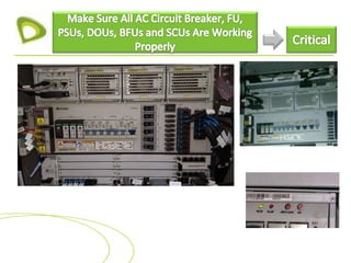 - Specific installation, configuration, and testing instructions are given for items like antennas, radios, fiber cables, power equipment, batteries, and alarms. Proper grounding, arrangement, and labeling is emphasized.